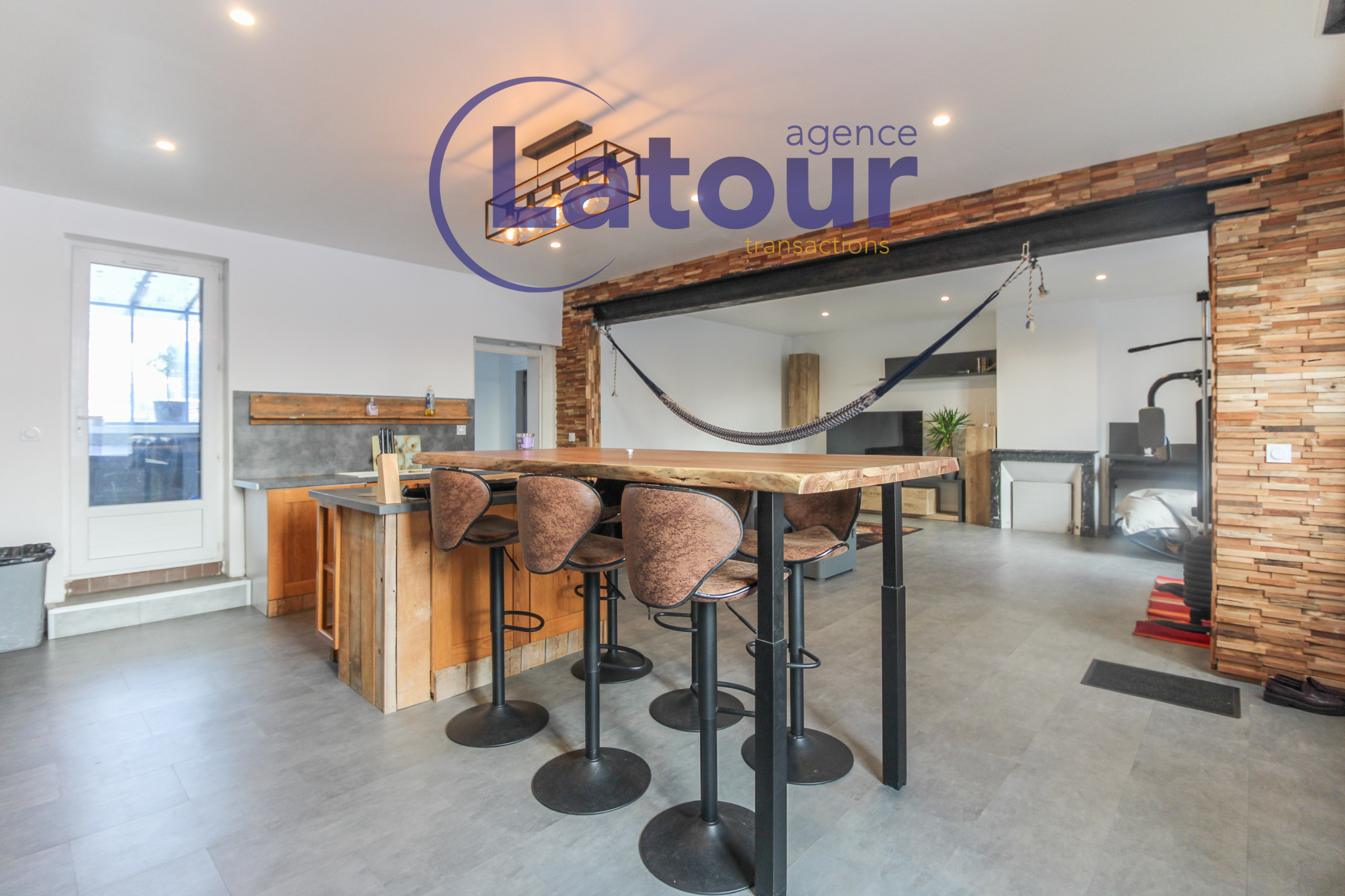 Vaste séjour avec cheminée, cuisine ouverte avec cheminée, verrière, dégagement, WC séparés, chambre, salle de bains, bureau. A l'étage : une chambre.